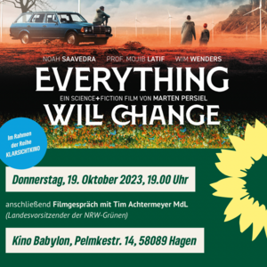 21.09.23 - Wir zeigen am Do., 19.10., im Kino Babylon den Film EVERYTHING WILL CHANGE. Dieser erzählt vom abenteuerlichen Road-Trip dreier Freunde, die im Jahr 2054 eine sterile, betonierte Welt bewohnen. Als sie erfahren, dass ihr Planet einst von reicher, bunter Schönheit geprägt war, machen sie sich auf eine Reise, um Antworten auf ihre immer größer werdenden Fragen zu suchen.