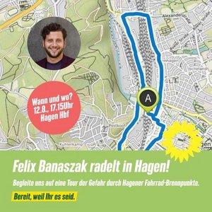 11.08.21 - Am Donnerstag, den 12.08.2021 kommt Felix Banaczak, Landesvorsitzenden der GRÜNEN NRW, zu einer Radtour nach Hagen, um auf die Hindernisse und Gefährdungen für Radfahrende In Hagen hinzuweisen. Kommt mit! Nehmt teil!
