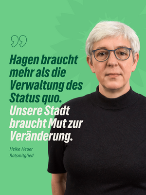 „Hagen braucht mehr als die Verwaltung des Status quo", erklärt Heike Heuer, Ratsmitglied der GRÜNEN und Mitglied im Infrastrukturausschuss der Stadt Hagen. „Unsere Stadt braucht eine positive, gemeinschaftliche und nachhaltige Entwicklungsperspektive. Stattdessen dominieren Ordnungspolitik und kleinteilige Verwaltungsziele. Das ist für uns ein Zeichen fehlender Prioritäten."