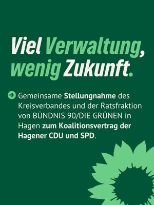 Anfang dieser Woche haben CDU und SPD in Hagen ihren Koalitionsvertrag unter dem Titel „Gemeinsam Hagen gestalten" präsentiert. Während der Vertrag ausführlich Ordnungspolitik, Verwaltungsabläufe und interne Abstimmungen regelt, bleiben konkrete eigene Ziele für Klimaschutz, Energiewende und Klimaanpassung außen vor. Eine klare Perspektive, wie Hagen sozial gerecht und zukunftsfähig werden soll, erkennen wir nicht. Wie unsere Stadt ihre Lebensgrundlagen sichern und klimaneutral werden kann — darauf bleibt der Vertrag die Antwort schuldig.