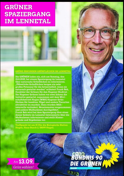 „Öffentliche Grünflächen bergen ein sehr großes Potenzial für die Artenvielfalt, wenn sie naturnah gestaltet werden“ erläutert Frank Reh, Kandidat der Grünen für den Hagener Stadtrat . Die Hagener Grünen haben vor zwei Jahren die Initiative gestartet, zusammen mit dem Wirtschaftsbetrieb Hagen (WBH) Hagener Grünflächen für Insekten, Vögel und andere Tierarten attraktiver zu machen. Dazu wurden Mähintervalle verändert, Neueinsaaten vorgenommen und andere Maßnahmen durchgeführt. Frank Reh wird bei dem Spaziergang über eines dieser Gebiete im Lennetal Interessierte über die Maßnahmen informieren und stellt Hintergründe und Ergebnisse vor. Treffpunkt ist um 15 Uhr die Biologische Station Hagen, Haus Busch 2, 58099 Hagen.