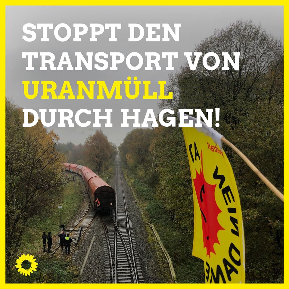 Während Sicherheits- und Gesundheitsbehörden durch die Coronakrise aufs Äußerste angespannt sind, will die Firma Urenco das Risiko für die Bevölkerung zusätzlich durch Atommülltransporte erhöhen. Eine der geplanten Routen führt durch Hagen. Das ist unverantwortlich, sagen Die GRÜNEN in Hagen und fordern Landes- und Bundesregierung zum Stopp der Transporte auf. Dazu erklärt Kreisverbandssprecherin Christa Stiller-Ludwig: „Mitten in der Coronakrise will die Urananreicherungsfirma Urenco einen Transport mit Uranmüll durch unsere Region zu einem niederländischen Seehafen bringen. Was schon in normalen Zeiten kritisch zu sehen ist, stellt in Zeiten von Corona ein untragbares Risiko dar. Alle, die für die Sicherheit und Gesundheit der Bevölkerung zuständig sind, arbeiten seit Wochen an der Belastungsgrenze. In einer solchen Zeit muss der Transport von Atommüll zurückgestellt werden. Sollte ein Transport verunglücken und ein Transportbehälter beschädigt werden, entsteht in der Reaktion mit Wasser hochgiftige Flusssäure. Da die Züge durch unsere dicht besiedelten Gebiete fahren, wäre in einem solchen Fall mit zahlreichen Verletzten zu rechnen bei denen nicht sicher wäre, ob alle versorgt werden könnten. Die Atomfirma Urenco versucht offenbar auszunutzen, dass wegen der Corona-Krise derzeit Demonstrationen untersagt werden. Wir fordern die Landesregierung und die Bundesregierung auf, eine zusätzliche Gefährdung der Bevölkerung durch einen Atomtransport zu untersagen.“ Eine Karte über geplante Transportwege ist unter dem angefügten Link zu finden. umap.openstreetmap.de/de/map/urantransport_1759 8lPhI7ujhMraSHNdeQ9gIYZk8rZLh7ZAi2tJCL-ii8ZmT8#8/51.809/5.883