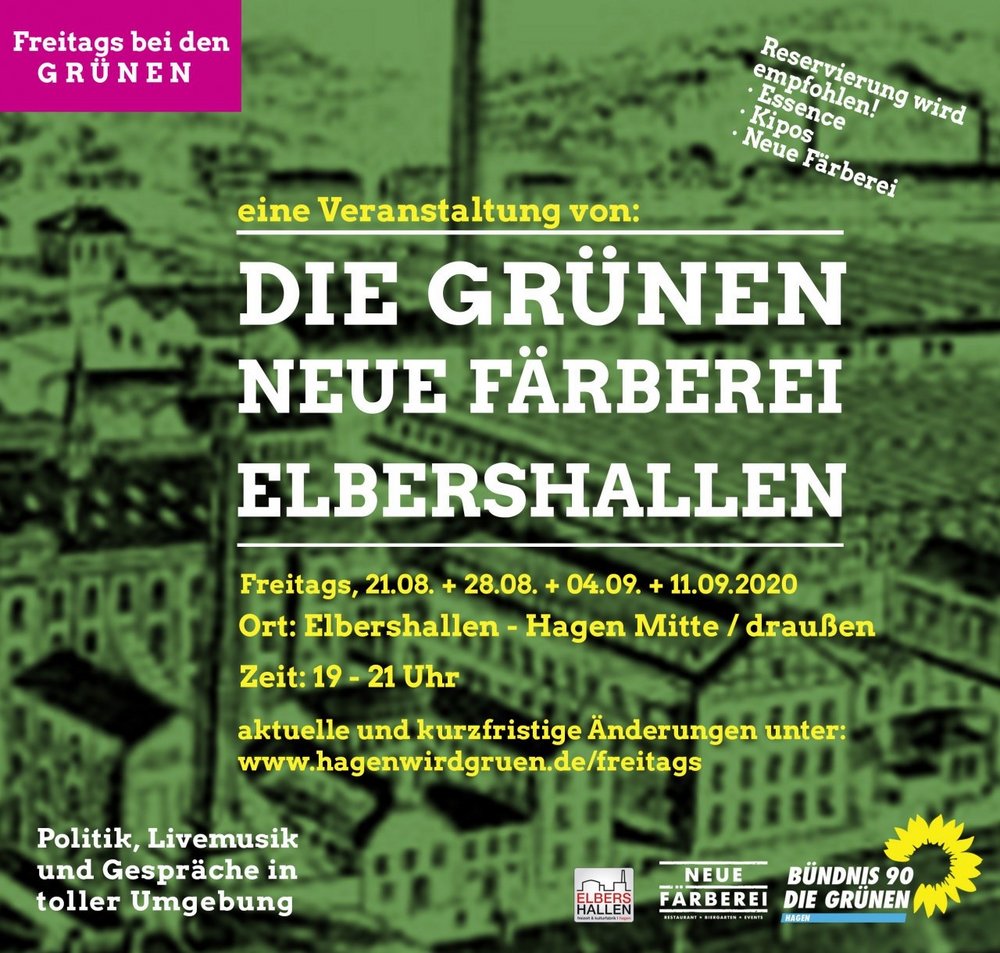 Die Verkehrspolitik in Hagen steht im Zentrum der Veranstaltung „Freitags bei den Grünen“, die am 11. September 2020, ab 19 Uhr auf dem Gelände der Elbershallen stattfindet. Oberbürgermeister Erik O. Schulz stellt sich Fragen zu den künftigen Zielen der Verkehrspolitik in Hagen. Nicole Schneidmüller-Gaiser moderiert die Veranstaltung, auf der auch Kandidatinnen und Kandidaten der Grünen ihre Ziele zum Radverkehr, zur Luftreinhaltung und der Zukunft von Bus und Bahn vorstellen werden. Bürgerinnen und Bürger haben die Gelegenheit, ihre Fragen an Oberbürgermeister und Politikerinnen und Politiker zu stellen und mit Ihnen zu debattieren. Zwischendurch wird die Band Blonde Date für einen stimmungsvollen Spätsommerabend sorgen. Es wird empfohlen, Plätze in der neuen Färberei, im Essence oder Haus Kipos vorher zu reservieren.