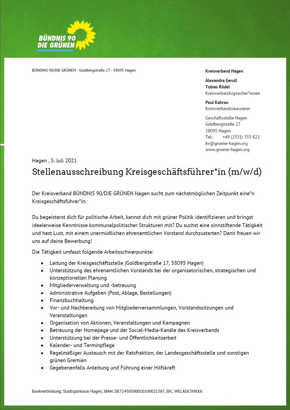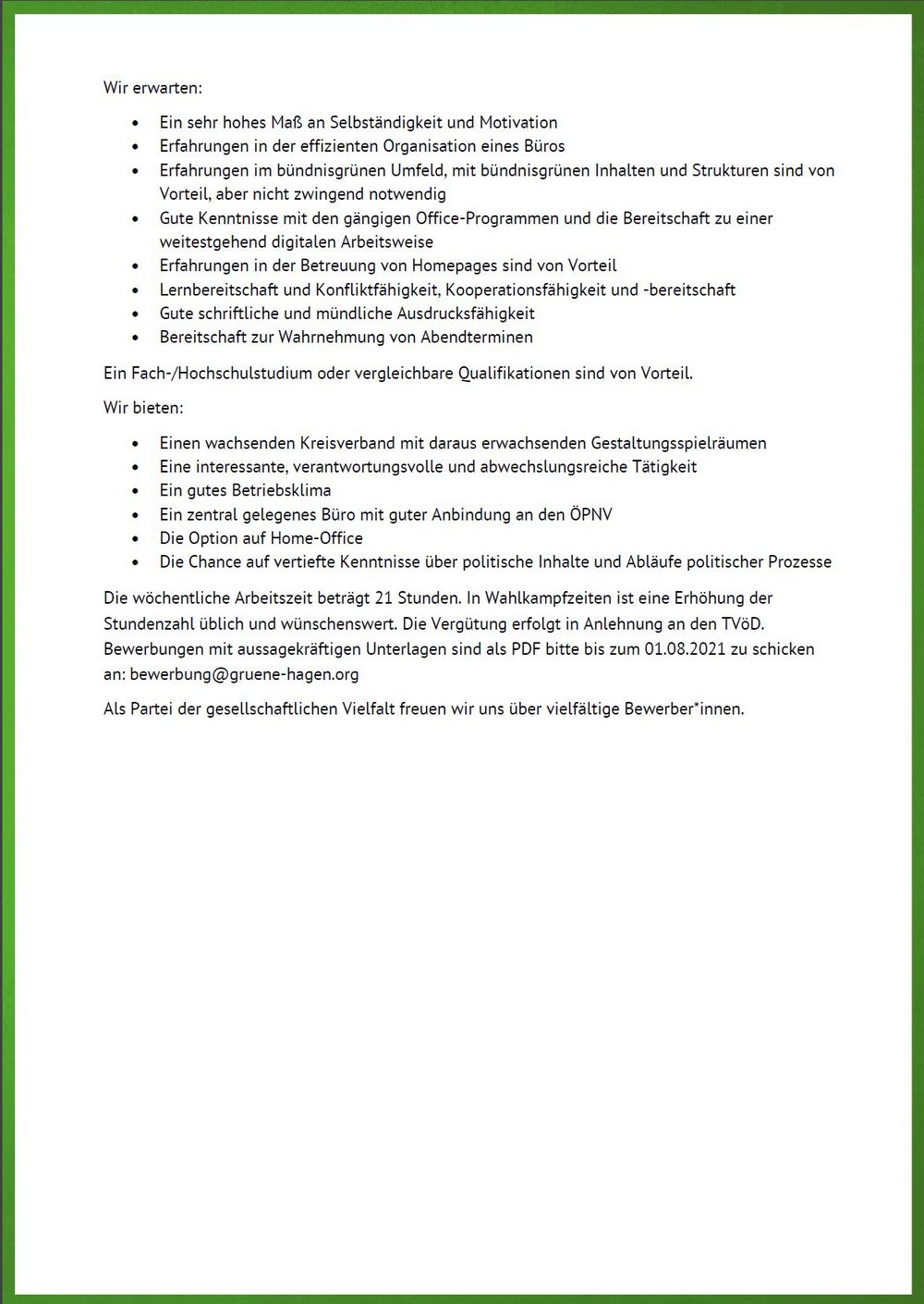 Die wöchentliche Arbeitszeit beträgt 21 Stunden. In Wahlkampfzeiten ist eine Erhöhung der Stundenzahl üblich und wünschenswert. Die Vergütung erfolgt in Anlehnung an den TVöD. Bewerbungen mit aussagekräftigen Unterlagen sind als PDF bitte bis zum 01.08.2021 zu schicken an: bewerbung@gruene-hagen.org