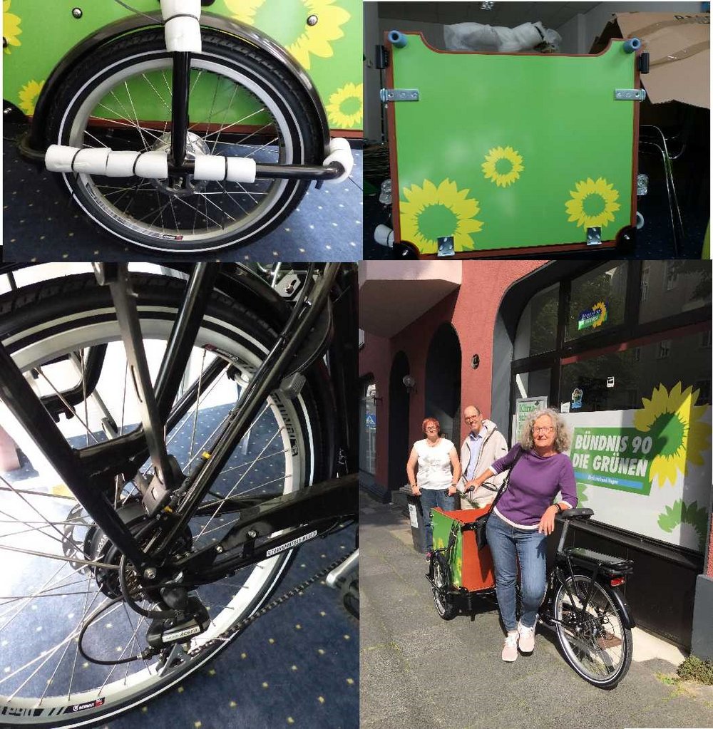 Es ist groß, schwarz glänzend und stabil. Unser brandneues Wahlkampf-Vehikel passte grade noch durch die Eingangstür. Das Lastenrad der Marke babboe wurde in Holland hergestellt und erhielt als Spezialanfertigung die Folie mit den Sonnenblumen auf dem Transportkasten. Mit den zwei kleinen Rädern vorn ist die Lenkung etwas ungewohnt. Aber unsere engagierten Radfahrer*innen brennen darauf, sich mit der Handhabung vertraut zu machen.