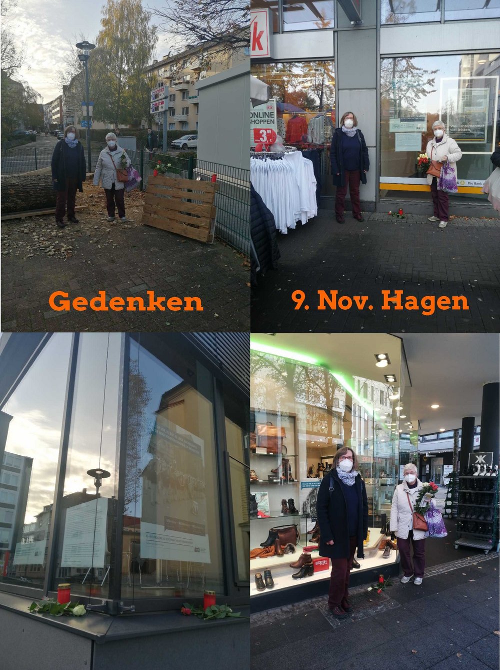 In der Elberfelder Straße 47, dort wo jetzt die Commerzbank eine Geschäftsstelle hat, gründeten die Brüder Alsberg 1875 ein Textilgeschäft. Es wurde unter Zwang verkauft – arisiert, wie es nach 1933 hieß. Hier war die erste Station von insgesamt neun, die an jüdisches Leben in Hagen erinnerten. Da am 9. November in diesen Corona-Zeiten keine Gedenkveranstaltung mit vielen Teilnehmer*innen möglich war, hatte die Gesellschaft für christlich-jüdische Zusammenarbeit zu einem persönlichen, individuellen Gedenken aufgerufen. Karin und Ruth sind diesem Aufruf gefolgt und haben an den neun Erinnerungsorten Blumen niedergelegt und eine Kerze entzündet – auch in der Hoffnung, mehr Aufmerksamkeit für die Plakate und informativen Texte zu wecken. Ende des Rundgangs war die Synagoge in der Potthofstraße.
