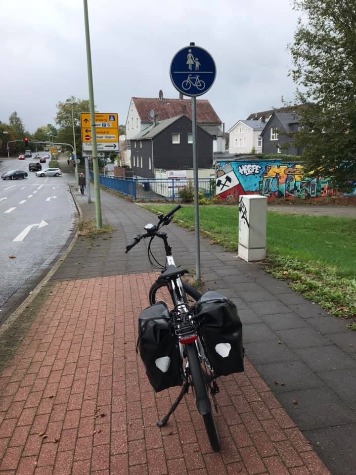 Jenseits des Hasper Zentrums führt der Radweg im Gegenverkehr über den Bürgersteig an der Leimstraße entlang - auch den teilen sich wieder Fußgänger und Radfahrer. Vor mir läuft ein älterer Mann mit einem Paket Eier - ich bremse natürlich ab und rufe „Vorsichtig.“ Reflexartig dreht er sich um und grummelt: „Warum klingeln Sie nicht?“ Anhalten, absteigen, lächeln. „Damit Sie sich nicht erschrecken und die Eier fallen lassen“. Jetzt muss er auch lächeln. „Aber Sie müssen doch rechts fahren“, meint er sich noch im Recht - also erkläre ich ihm freundlich den Unterschied zwischen den beiden recht ähnlichen Schildern, die im einen Fall genau definieren, welche Seite für den Radfahrer ist, und im anderen, hier vorliegenden Fall aber eben den Radfahrer zum Bremsen zwingen.