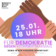 18.01.24 - Das Hagener Bündnis „Bündnis Offen Bunt“ (BOB) ruft für Donnerstag, den 25.01.2024, um 18 Uhr zu einer Demonstration „Für Demokratie – gegen Rechtsextremismus“ auf. Anlass sind die jüngsten Veröffentlichungen zu geplanten Abschiebungen der rechtsextremen AfD durch das Rechercheteam Correctiv.