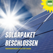 18.08.23 - Das Bundesministerium für Wirtschaft und Klimaschutz (BMWK) unter Leitung von Dr. Robert Habeck hat am vergangenen Mittwoch im Kabinett das „Solarpaket“ beschlossen. Die Hagener GRÜNEN freuen sich über diesen Schritt, denn damit bekommt Hagen Rückenwind für den weiteren Ausbau der Photovoltaik (PV). „Ab dem kommenden Jahr wird es noch einfacher, Balkonkraftwerke (BKW) zu installieren und in Betrieb zu nehmen“, erläutert Vorstandsmitglied Paul Kahrau einen der neuen Aspekte…