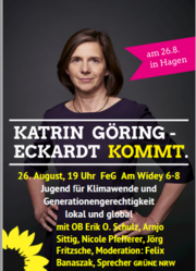 13.08.20 - Wir laden herzlich ein zu einem Austausch über Jugend für Klimaschutz und Generationengerechtigkeit - lokal wie global. Wir freuen uns sehr, dass unsere Fraktionsvorsitzende im Bundestag, Katrin Göring Eckardt nach Hagen kommt. sie wird mit Arnjo Sittig stellvertretend vür den Jugendrat der Generationenstiftung diskutieren. Wie das Thema auf lokaler Ebene zu bearbeiten ist diskutieren der grün-getragene OB-Kandidat Erik O. Schulz und das grüne Spitzenteam für Hagen,…
