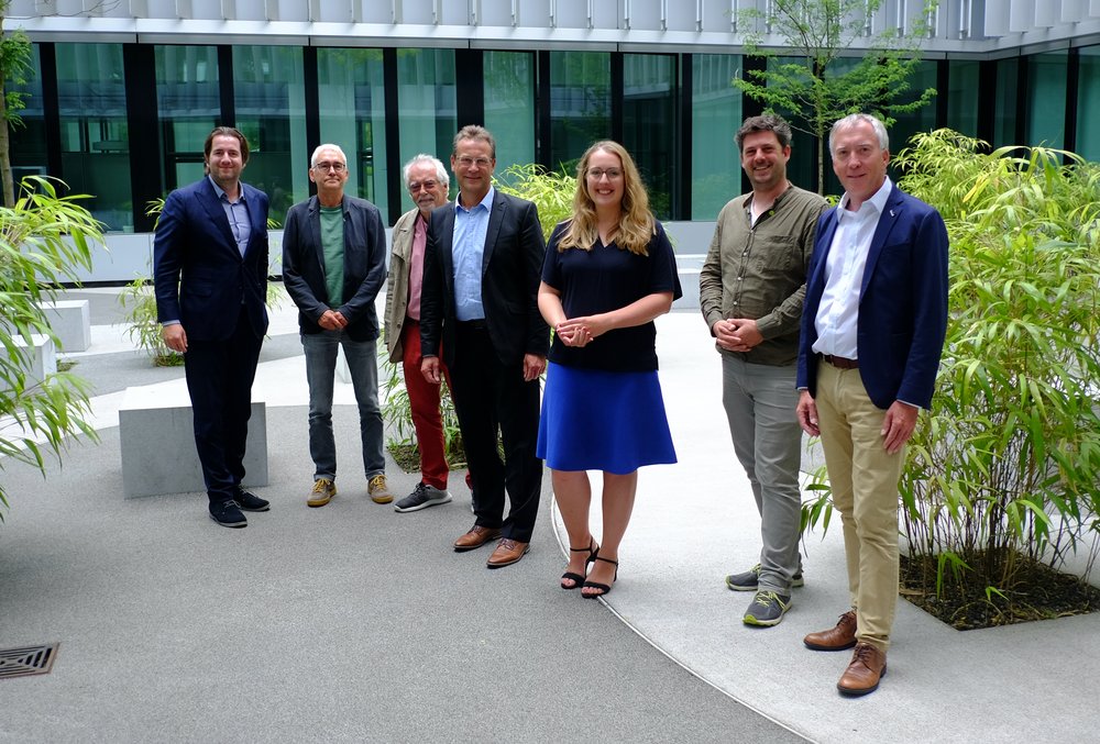 Foto vlnr: Alexander ten Hompel (Stabsabteilungsleiter Marketing/Kommunikation, Enervie), Joachim Riechel (Aufsichtsratmitglied Enervie, BÜNDNIS 90/DIE GRÜNEN Hagen), Rüdiger Ludwig (Vorsitzender das Umweltausschusses, BÜNDNIS 90/DIE GRÜNEN Hagen), Volker Neumann (Vorstandsmitglied, Enervie), Katharina Dröge (Fraktionsvorsitzende BÜNDNIS 90/DIE GRÜNEN), Tobias Rödel (Kreisverbandssprecher, BÜNDNIS 90/DIE GRÜNEN Hagen), Klaus Leßmann (Projekte Erneuerbare Energien, Enervie)