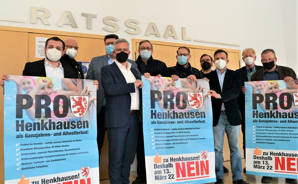 Vier Tage vor dem Bürgerentscheid zum Lennebad appellieren Vertreter der Hagener und Hohenlimburger Parteien und Wählergemeinschaften von CDU, SPD, Bündnis 90/Die Grünen, FDP und Hagen Aktiv gemeinsam mit der Stadtspitze um Oberbürgermeister Erik O. Schulz, Kämmerer Christoph Gerbersmann und Baudezernent Henning Keune an die Bürgerinnen und Bürger, die beste Lösung für Hohenlimburg zu wählen. Dabei ist die Botschaft klar: Nur mit einem „Nein“ am kommenden Sonntag wird das Ganzjahresschwimmen in der Lennestadt für die nächsten Jahrzehnte gesichert. Denn nur so wird es möglich sein, das Freibad Henkhausen in ein modernes und zukunftssicheres Ganzjahresbad umzuwandeln.